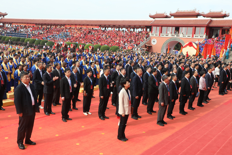 在司儀的引導下,嘉賓代表緩步走向媽祖圣像,敬獻花籃。祭典尾聲,通贊朗聲誦讀祝文,祈愿響徹云霄:“一愿兩岸和平;二愿民族昌盛;三愿海絲之路,一帆風順!”