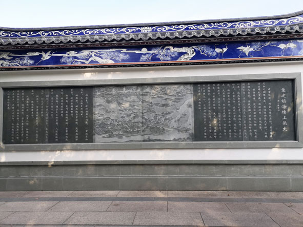 重建的鎮海樓比原來抬高了10米,登上這抬高的石階,來到一樓前,映入眼簾的是一塊鑲著一塊長約三米、寬約一米五的雙龍騰云駕霧的巨幅青石浮雕,栩栩如生,雙龍矯健威武。浮雕下方,還刻有一對如意。
