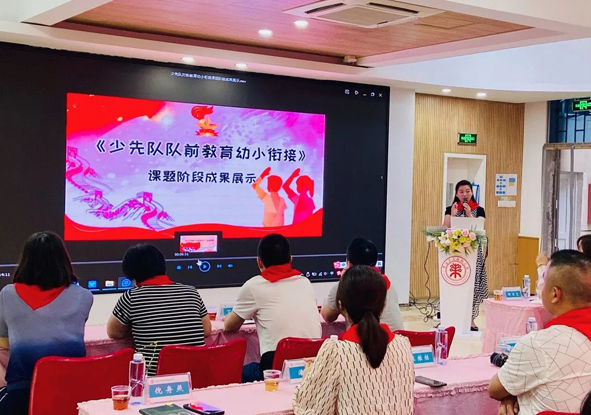 晉安區“隊前教育幼小銜接”的課題承辦園——晉安區實驗幼兒園,園長連勝作為課題組副組長對歷時三個多月的課題開展情況進行詳細介紹。通過問卷調查教師和家長對隊前教育的關注度、知曉度及認可度,聚焦課題開展的三大阻礙,解決隊前教育“六知六會一做”認知的不足。通過專家引領、學習觀摩、教研探討等形式,根據幼兒的心理特點,教育形式上創新,教學內容上滿足幼兒的需求,形成了教研集和教學案例集。