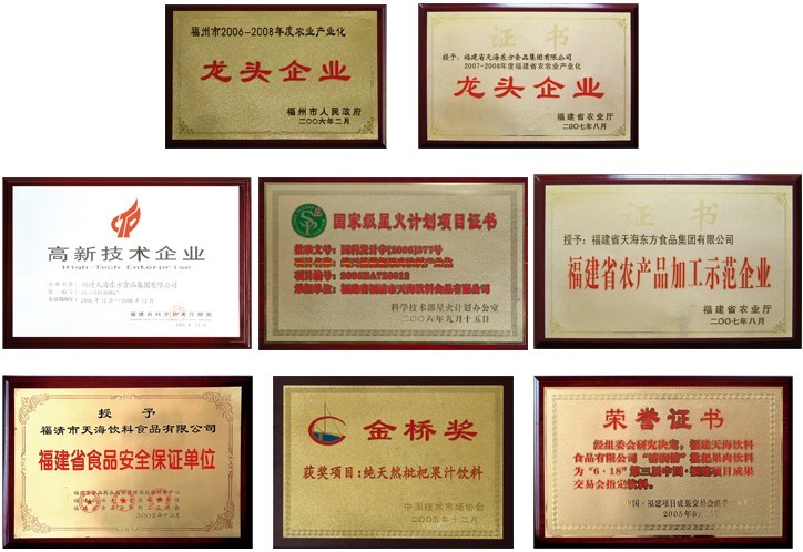福建省天海東方食品集團有限公司系福建省農牧業產業化龍頭企業。主要生產經營純天然枇杷果肉飲料、枇杷花茶、枇杷野(蔬)菜汁復合飲料等系列產品。公司注冊資金3000萬元人民幣,職工總人數521人,大專以上學歷占職工總數的51%,中級以上職稱人數為31人。目前公司引進具有國內領先水平的果汁飲料生產線1條、枇杷原漿生產線1條,形成年產2萬噸的果汁飲料生產能力。公司成立以來,始終堅持“以人為本、追求卓越,顧客滿意、永創新高”的質量方針,在省農業廳和各級部門的大力支持下,2005年度與中國農業科學院農產品加工研究所,共同開發的“清潤情”枇杷果肉飲料,產品榮獲中國市場協會金橋獎,第三屆中國國際農產品交易會暢銷獎;第三屆中國.福建項目成果交易會指定飲料。企業先后獲得福建省高新技術企業、福建省農產品加工示范企業等;公司承擔國家科技部的純天然枇杷果肉飲料產業化項目,被列入國家級星火計劃項目。